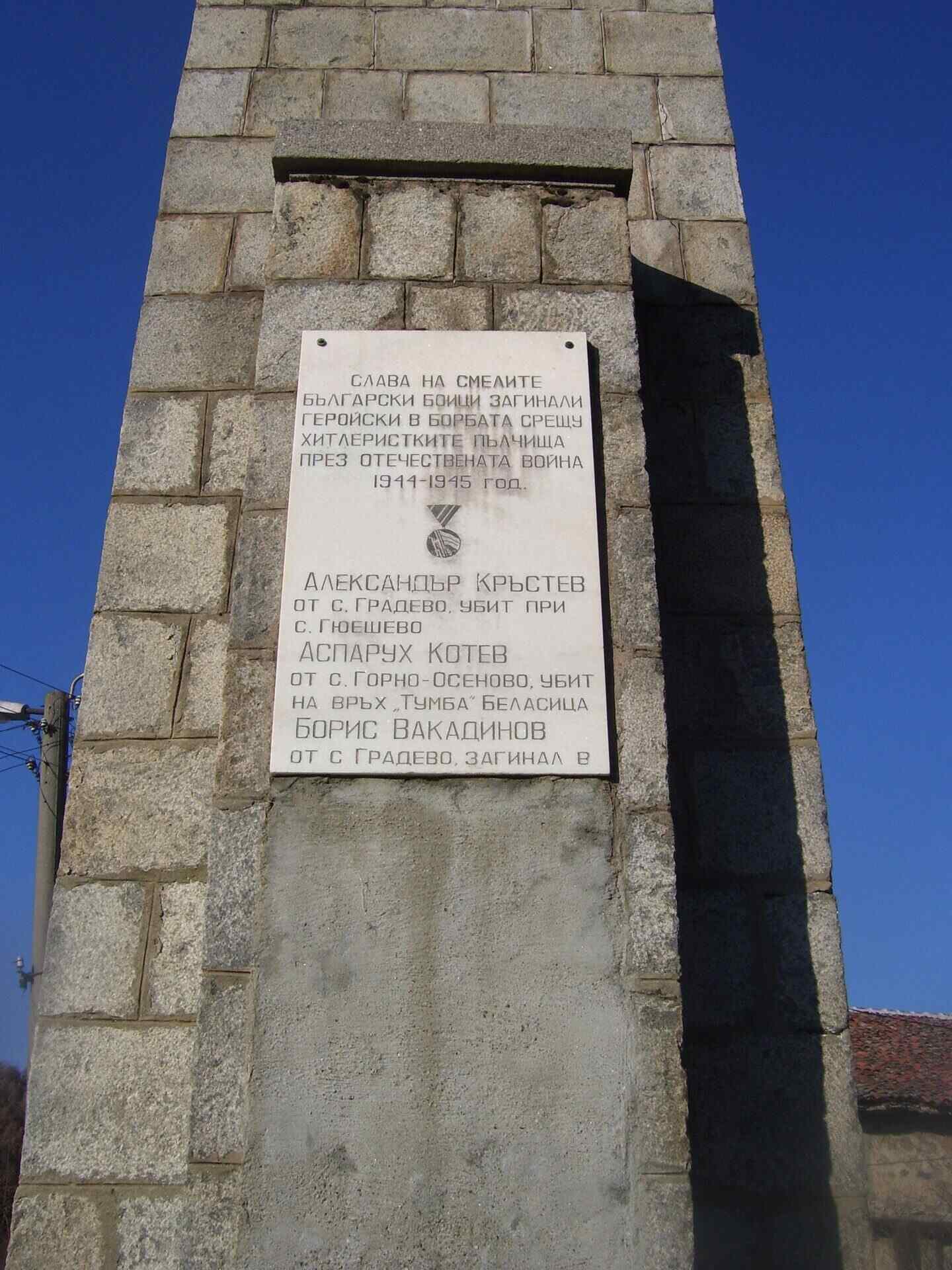 В селото има построен паметник на падналите във войните за България. Като отличил се герой е Александър Кръстев Масларски (1897 – 1944), убит през 1944 г. покрай Гюешево. По-големият му син Стоян Александров Масларски (1923 – 1996) също участва във Втората световна война. Той участва в основните военни действия при форсирането на река Драва. Завръща се от войната с военни почести.