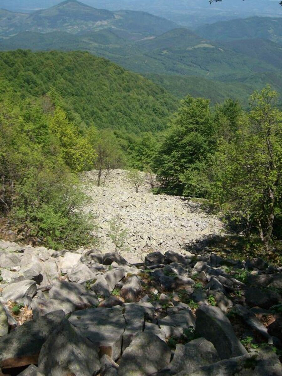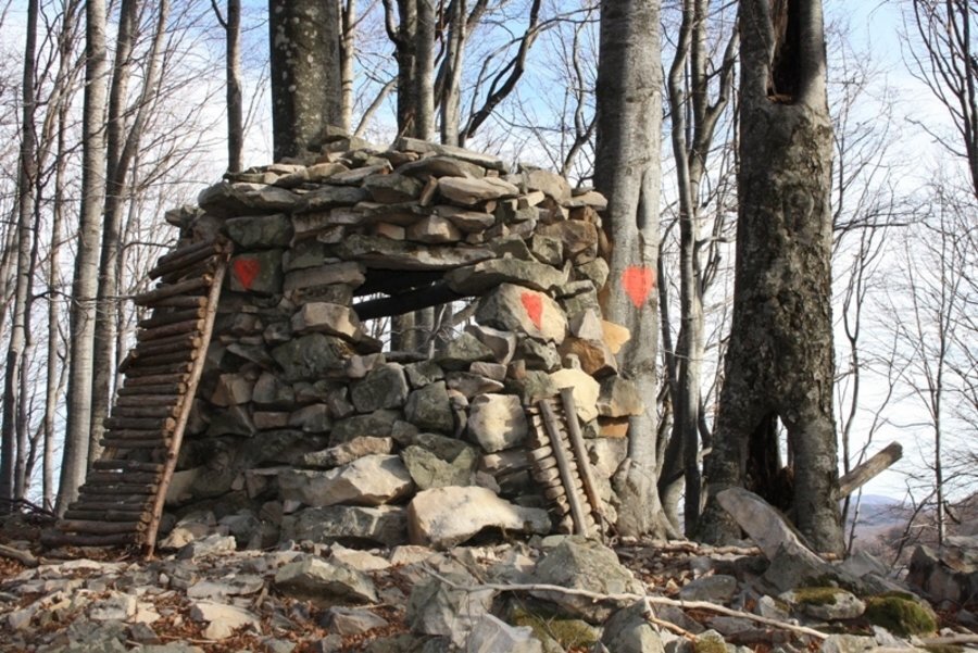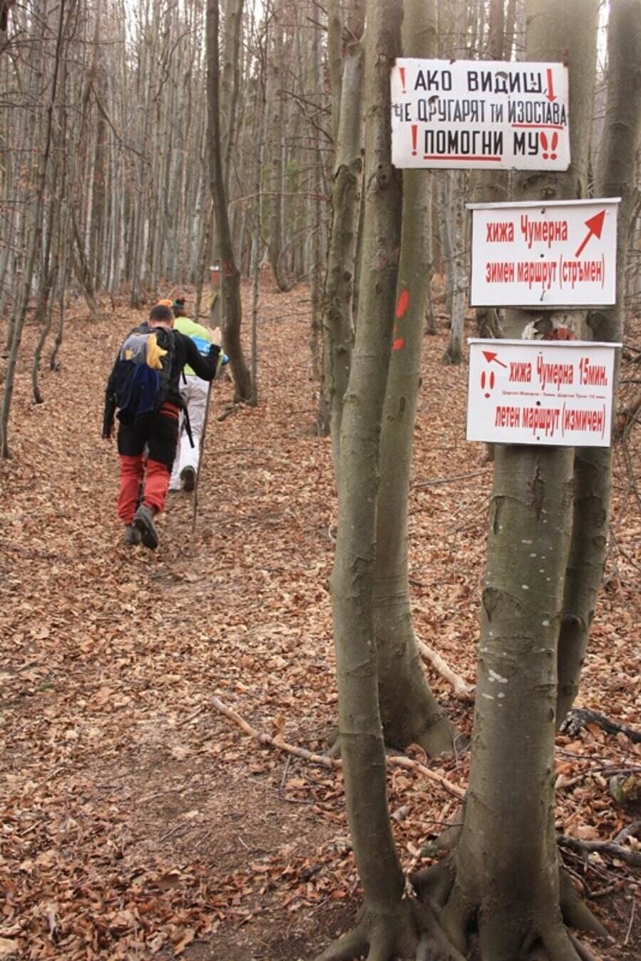 След около час и половина черният път достига до просторна поляна, където са изградени ловна наблюдателна кула и хранилище за диви животни. Оттам пътеката навлиза в гората и става по-трудна, като се изкачва по хребетите към върха на планината.