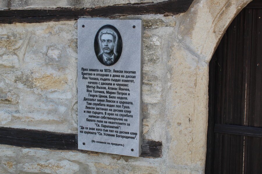В Брегово, на входа на храма "Св. Успение Богородично", се намира мраморна плоча, посветена на Васил Левски. На нея има негов образ и текст, според който през зимата на 1872 г. Левски идва в града. Той отсяда в къщата на даскал Йон Чолака, където основава комитет. Начело на комитета е даскалът, а членуват Митър Въсков, Атанас Йончев, Йон Димитров, Йон Топчиев, Марин Петров и Георги Ценов. В неделя даскалът води Левски до църквата, където службата е водена от поп Гуша. Апостолът застава на десния клир и пее сърцато. След приключване на литургията, той собственоръчно записва в бялото поле на Евангелието за Свети Харалампи: "Да се знае кога съм пял на десния клир на църквата "Св. Успение Богородично" - 10 февруари 1872 г. - Левски".