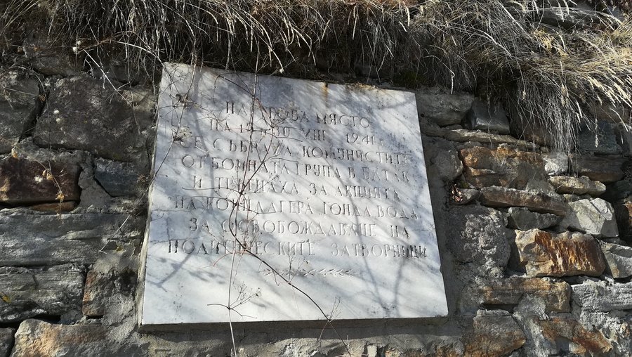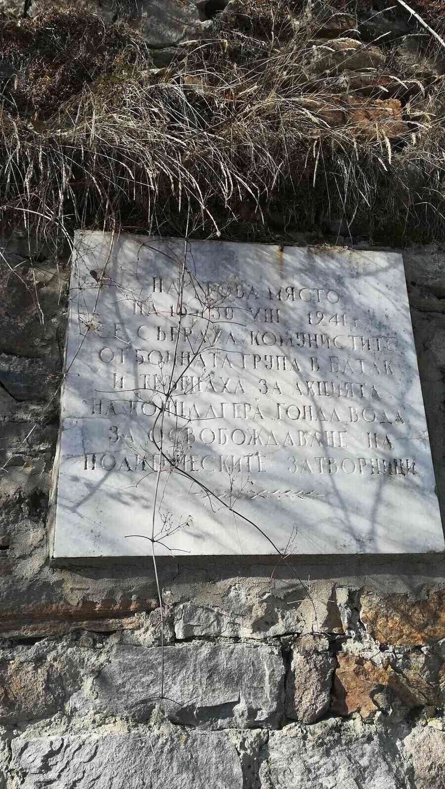 Възпоменателната плоча е разположена на мястото, където на 30 август 1941 г. комунисти от бойната група в Батак се събират и започват акция за освобождаване на политическите затворници, задържани в монархофашисткия лагер "Гонда вода" край Асеновград.