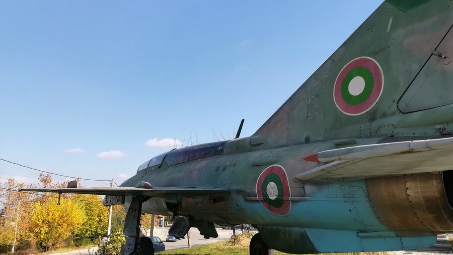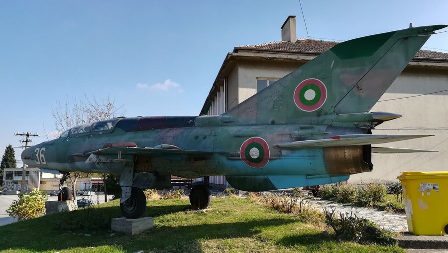 **МиГ-21УМ с бордов номер 36 (заводски номер 516999133*).** Изработен е на 12 януари 1978 г. в авиационния завод №31 в Тбилиси и предаден на Българските военновъздушни сили през 1990 г. Първоначално е разполаган на летище Балчик, а от 1998 г. се използва в авиобаза Граф Игнатиево. Експонатът е дарение от ръководството на ВВС на България и е инсталиран през май 2017 г.