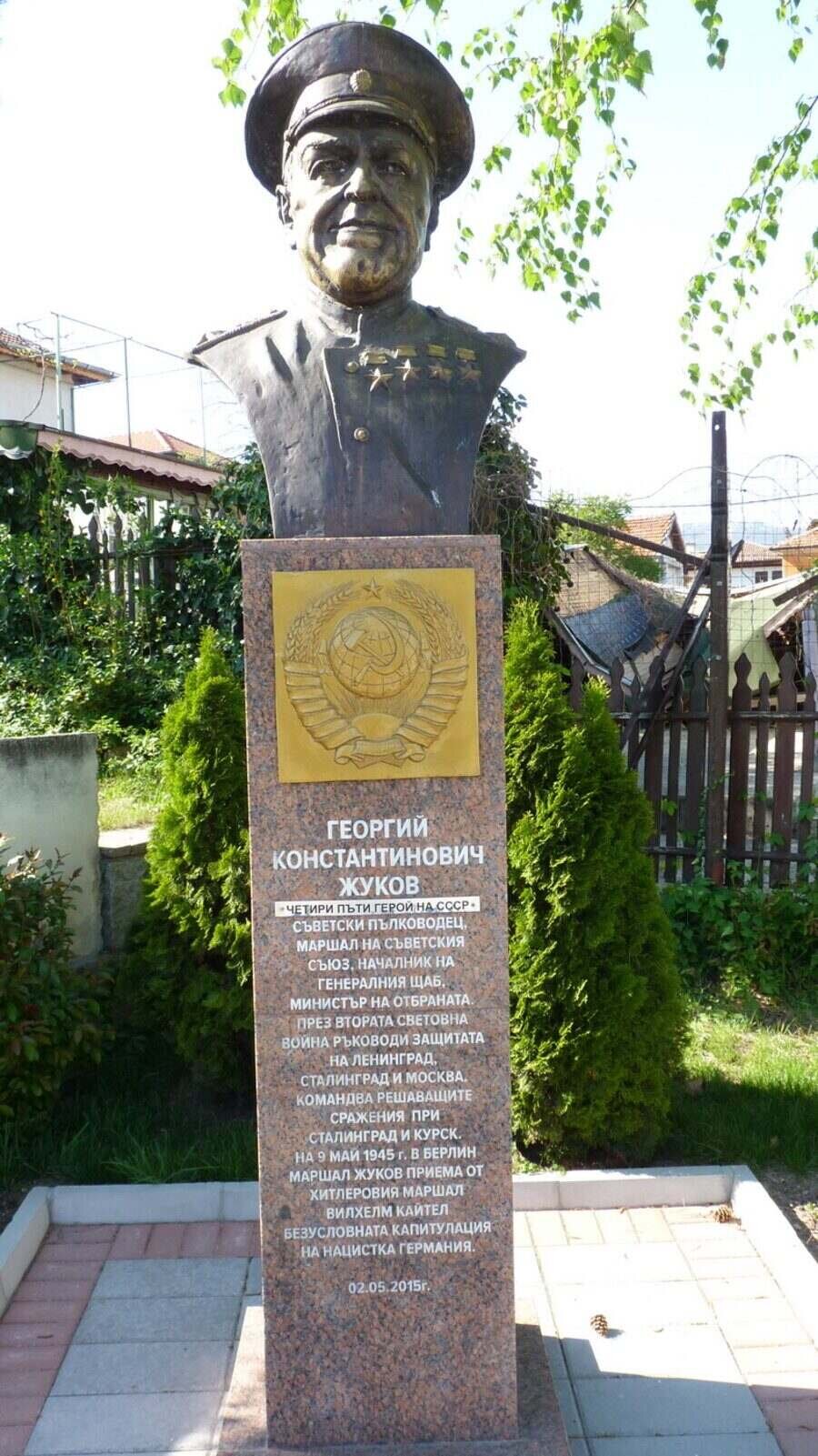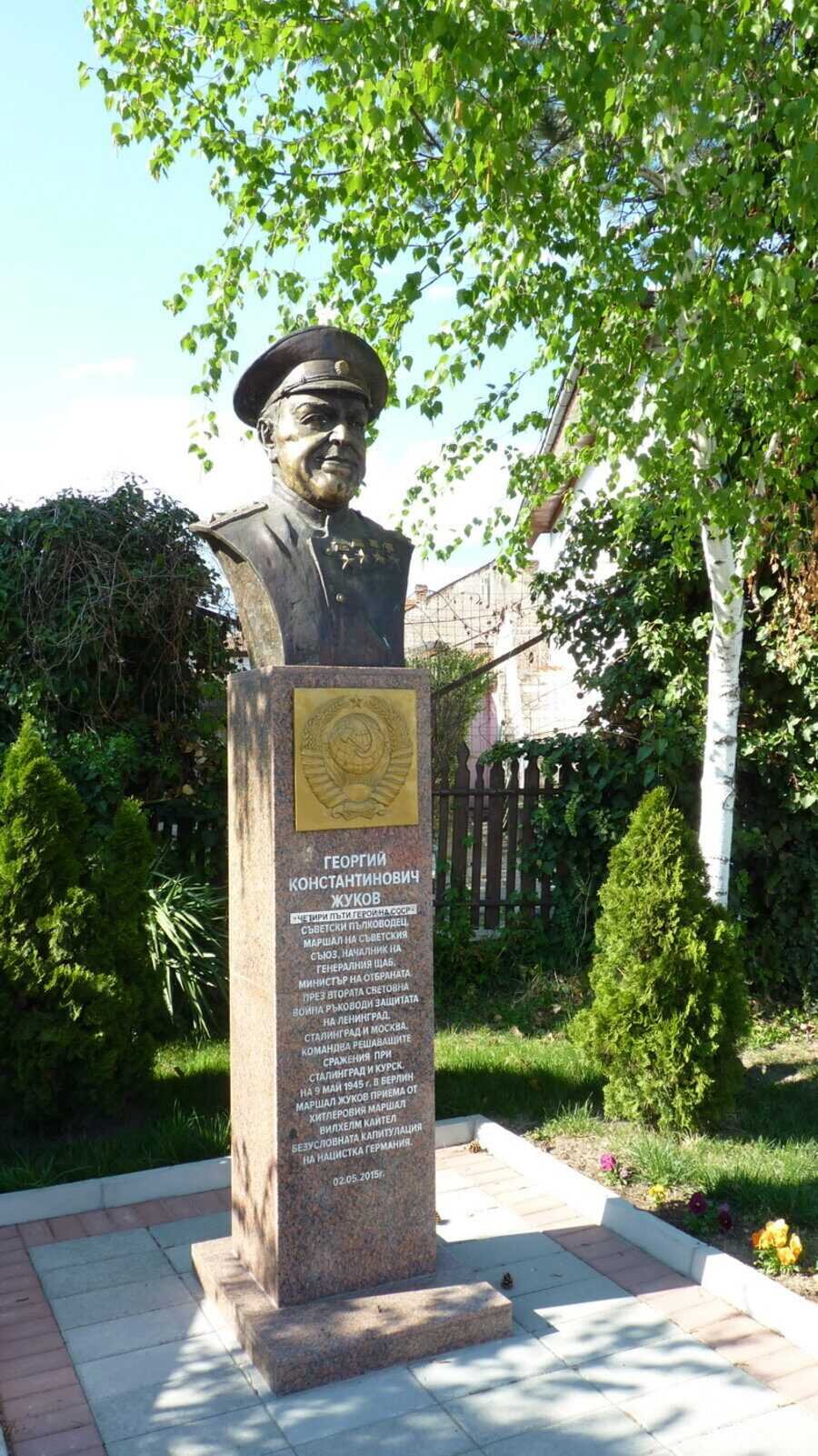 Георгий Константинович Жуков е известен съветски военачалник, който държи титлата маршал на Съветския съюз. Той е заемал длъжности като началник на Генералния щаб и министър на отбраната на СССР. Познат е и като "Маршал на победата", тъй като по негова присъста беше приета безусловната капитулация на Германия. Паметник в негова чест е открит на 02.05.2015 година от кмета на Стрелча, Иван Евстатиев.