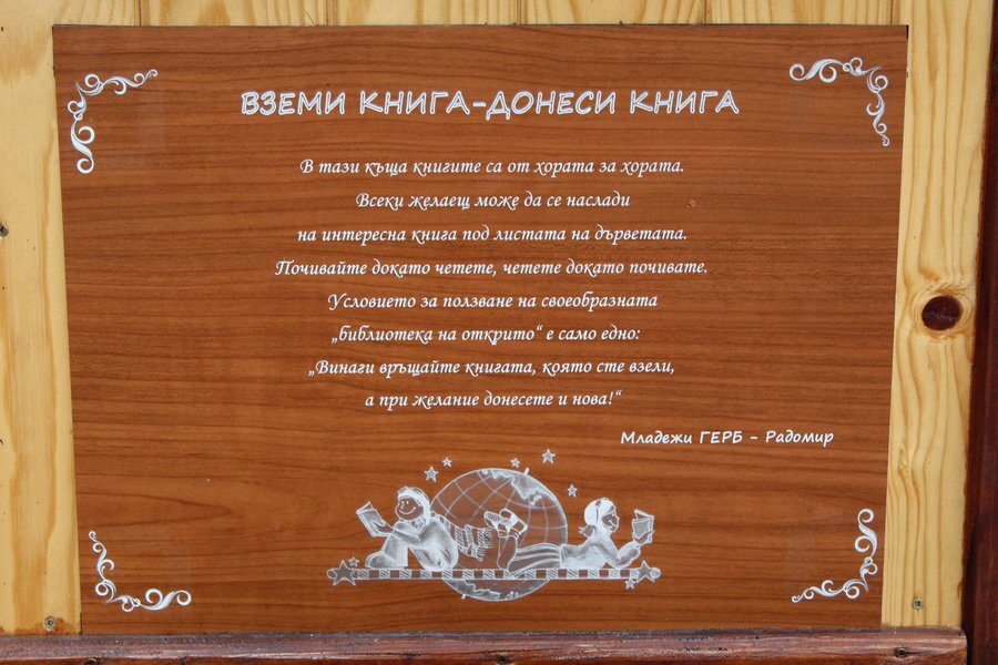 В Централния градски парк на Радомир се намира първата открита библиотека. Книжната къщичка позволява на всеки да вземе избрано произведение и да се потопи в четене. Тя бързо става предпочитано място за общуване и приятни разговори сред местните жители и посетители на града.