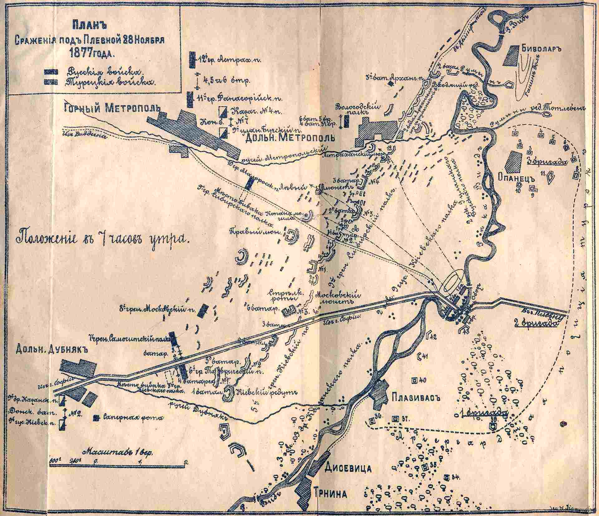 През октомври 1877 г. край Горна Митрополия са разположени значителни руски сили, участващи в обсадата на Плевен . Северно от селото по пътя за Тръстеник са били лагерите на 11 Фанагорийски и 12 Астрахански гренадирски полк. Към тях е придадена артилерия и два конни казашки полка (виж картата). Южно от селото са били лагерите на 9 Сибирски и 10 Малоросийски гренадирски полк. Полковете при Горна Митрополия са войските, които спират Осман паша при опита му да пробие руската обсада на 10 декември 1877 г. /стар стил 28 ноември/.