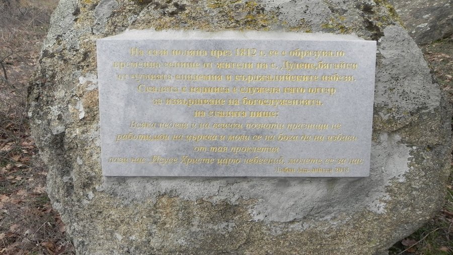 През 1812 г. жителите на село Дудене (днес Черничево) създали временно селище на това място, спасявайки се от чумна епидемия и нападения на кърджалии. Скалата с издълбан надпис е използвана като олтар за провеждане на религиозни обреди.