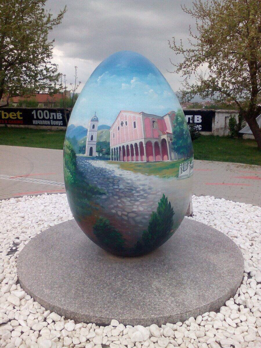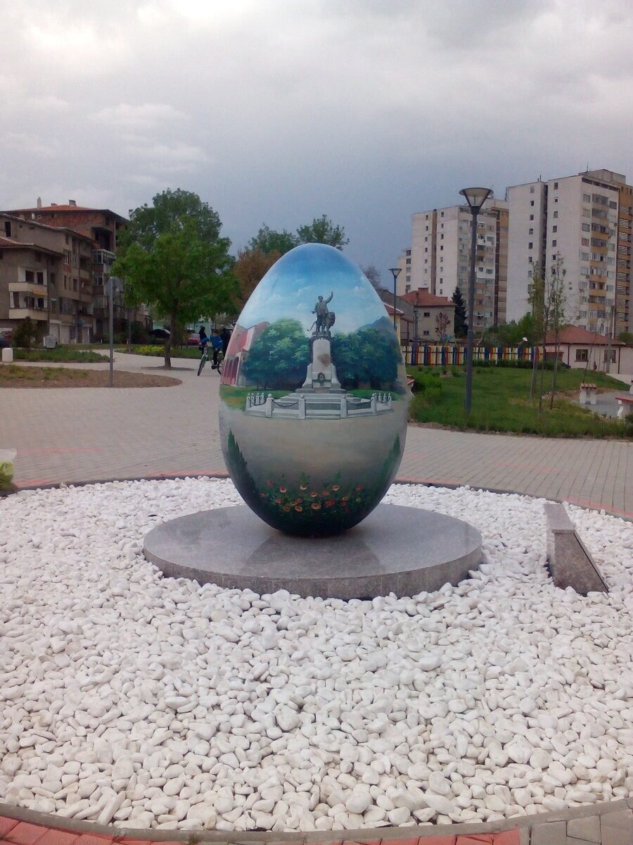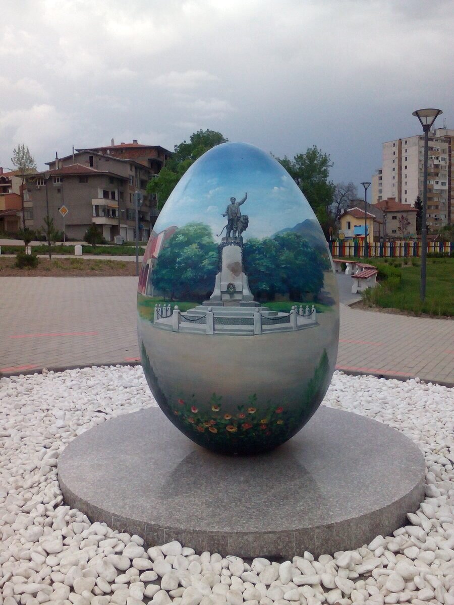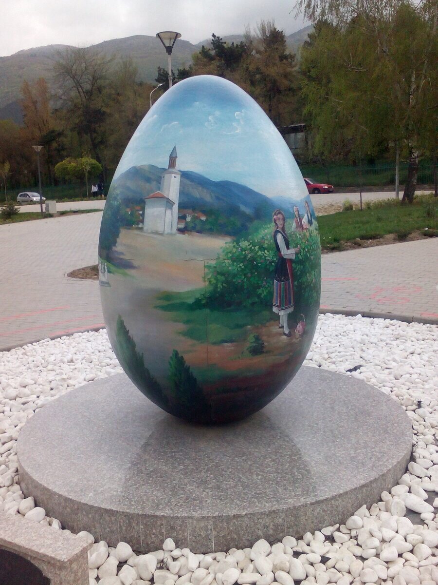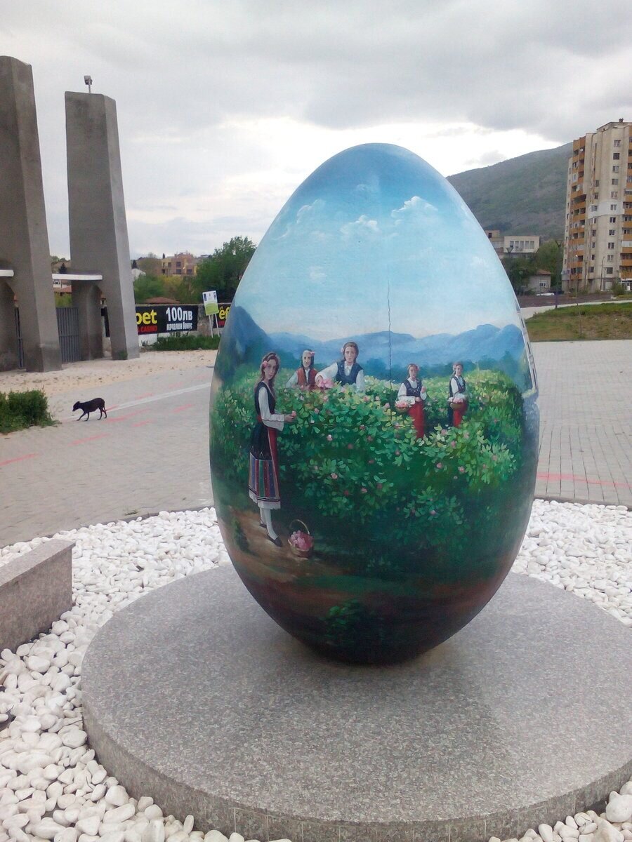Елегантно украсено с ярки цветове яйце, на което са изобразени ключови събития от нашата история. Разположено е близо до градския стадион. На отсрещната му страна се намира „Ловният парк“. Върху него са изобразени и традициите „Розобер“ и избирането на Царицата на розата.