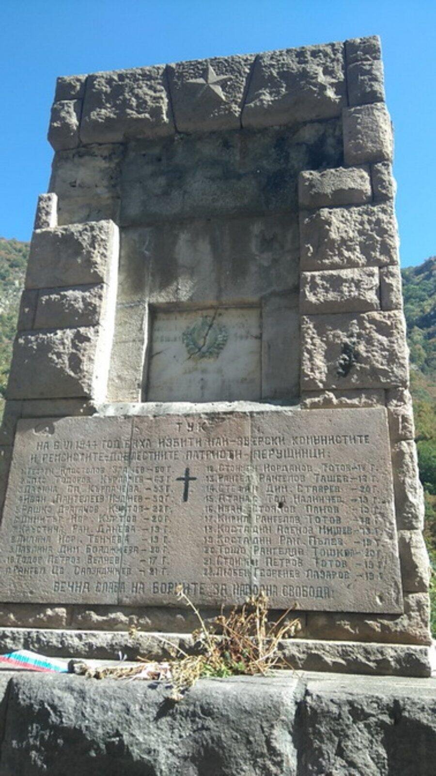 Мемориал в памет на 22 жители на Перущица, екзекутирани без съд на 6 юни 1944 г. На 28 май 1944 г. градът е обкръжен, а жандармерийци, водени от поручик Борис Балкански, арестуват около 60 души – поддръжници и свързани с партизаните. В нощта на 5 срещу 6 юни 22 от тях са откарани с камиони и разстреляни край река Въча, над Кричим.