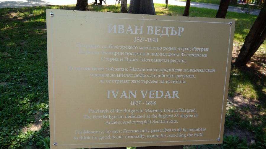 Архитект Вълко Цонев е автор на паметника. Той се състои от постамент, на който са изправени два бетонни триъгълника, покрити с червен мрамор. Върху отворен конус, направен от неръждаема стомана, е монтирана бронзовата глава на първия масон. Цветни лехи и място за почивка заобикаждат цялата композиция. Истинското име на Иван Ведър е Данаил Николов, роден в Разград през 1827 година. Той е първият българин, достигнал най-високата 33 степен в Стария и Приет Шотландски ритуал. Според него масонството налага на своите последователи да мислят добро, да постъпват мъдро и да се стараят за откриване на истината.