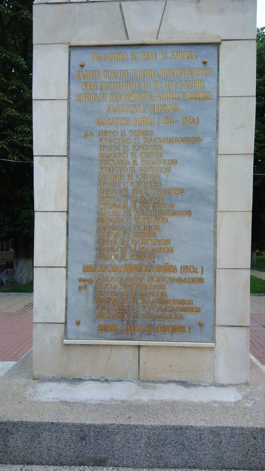 "С най-дълбока почит и безкрайна благодарност към жителите на град Цар Калоян, отдали живота си за Отечеството в Балканската война (1912–1913) и Междусъюзническата война (1913). „България, за теб загинаха! Вечна памет на храбреците!“"
