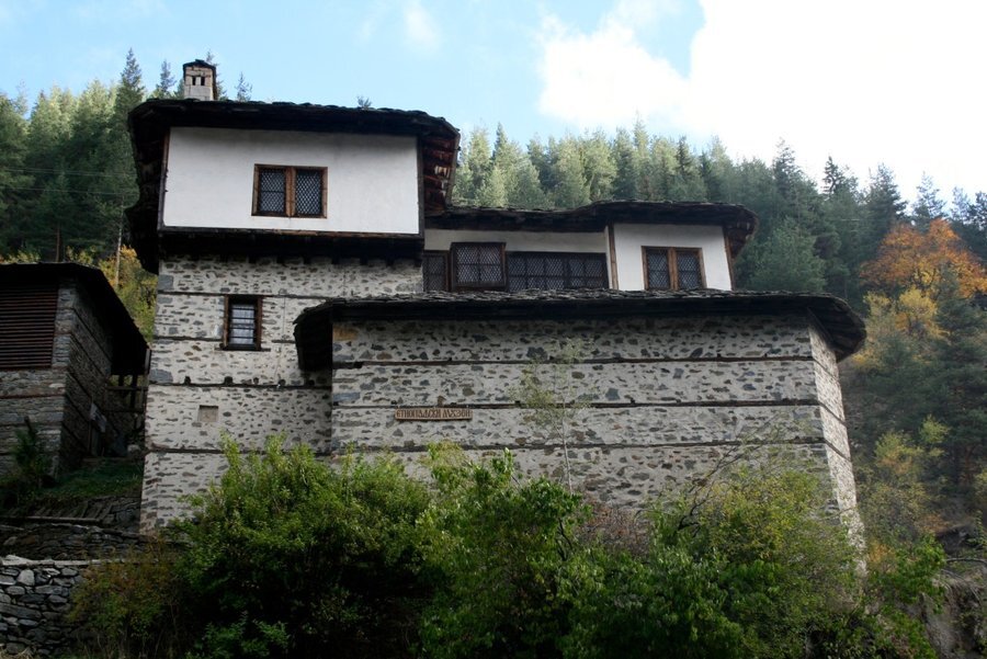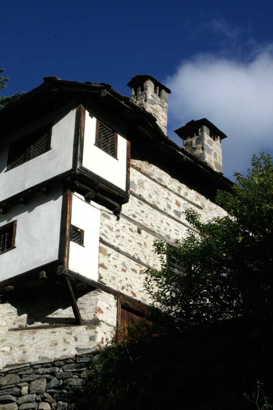 Къщата е впечатляваща отвън, вградена в скала и изглежда сякаш израства от камъка. Построена е основно от камък с дървени греди, наричани сантрачи, и е висока три етажа – близо 9 метра. Покривът е от каменни плочи, а комините са извити.