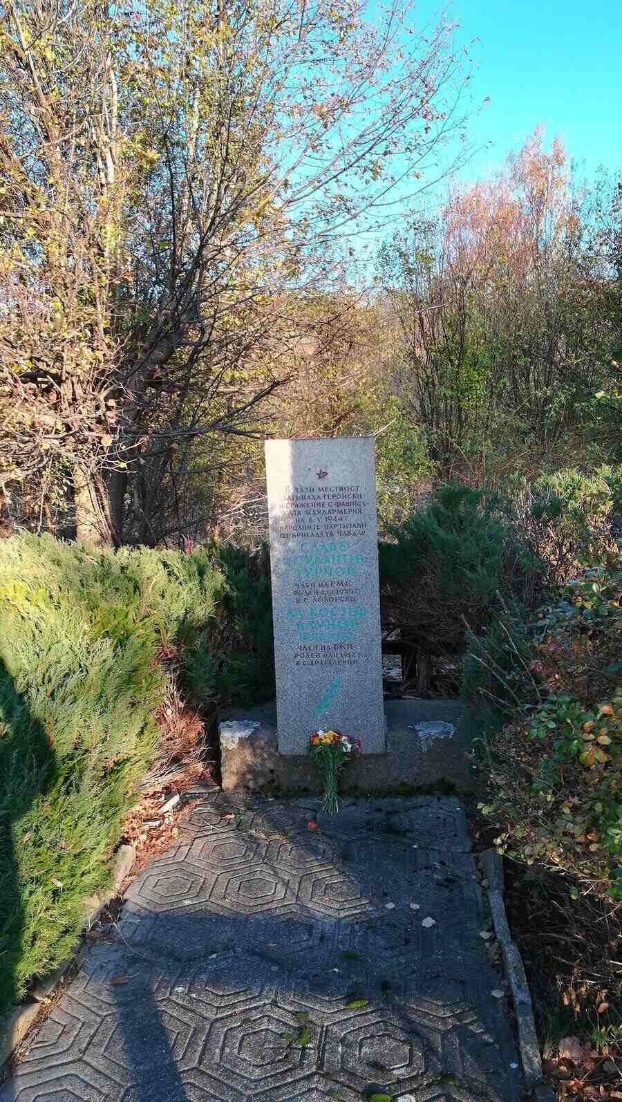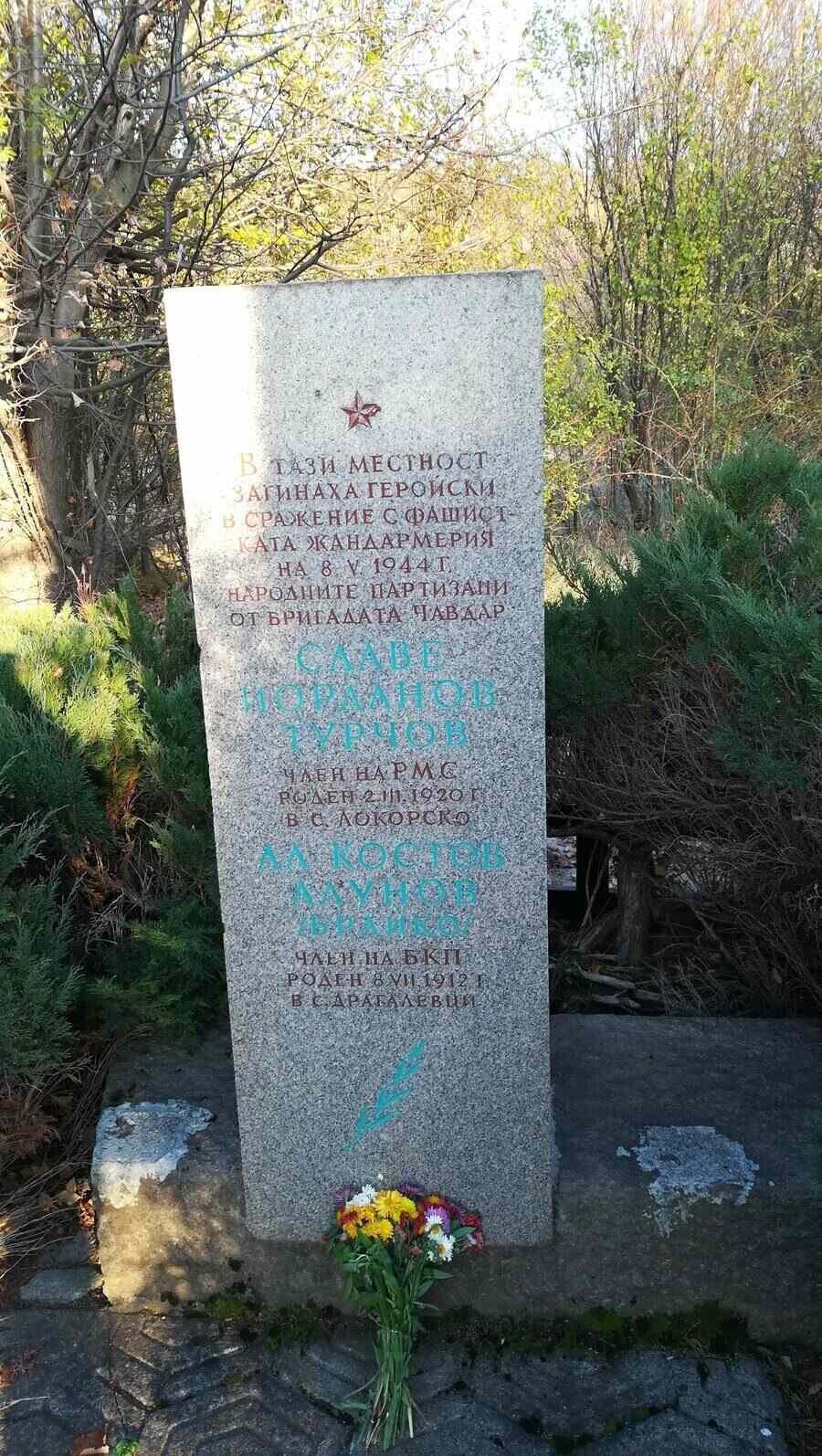 Паметник от гранит, издигнат в чест на загиналите партизани Славе Иванов Турчов и Александър Костов Алунов (Браико), убити на 8 май 1944 г.