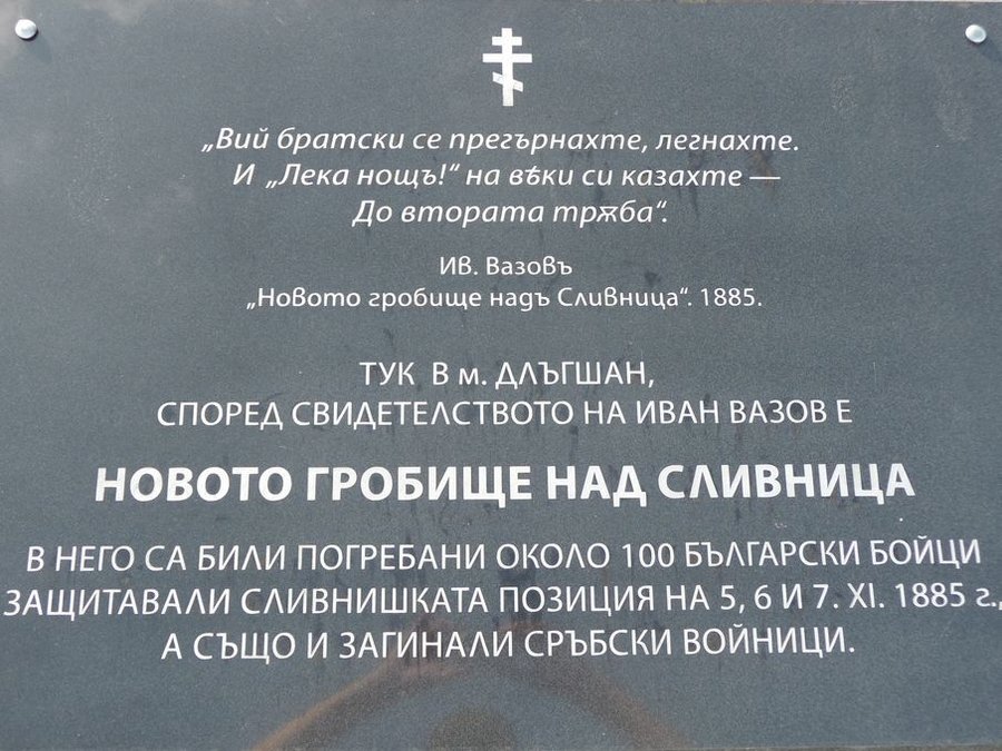На 1 юни 2010 година, в чест на 125-годишнината от Сръбско-българската война, беше открит паметен кръст в чест на загиналите войни от двете страни. Паметникът е висок шест метра, а до него има голяма скала с поставена мраморна плоча. Местността се нарича „Длъгшан“ и според Вазов това е „Новото гробище над Сливница“. Тук са погребани около стотица български войни, защитавали Сливнишката позиция между 5 и 7 ноември 1885 година, както и сръбски воини. На плочата е изписан откъс от стихотворението „Новото гробище над Сливница“ на Иван Вазов, създадено през 1885 година.