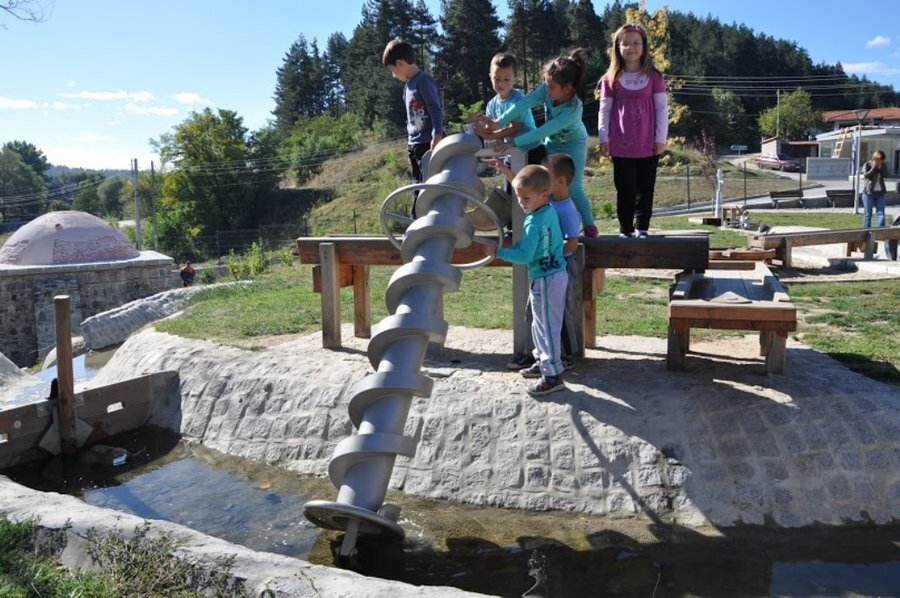 Архимедов винт, илюстриращ физичен принцип. С собствени усилия децата изкачват вода от дъното нагоре. С едно движение водата се загребва. След отваряне на първия бент, водата достига до втория и винтът започва ръчно да се върти. Водата се излива в по-ниско корито, като децата я направляват и владеят.