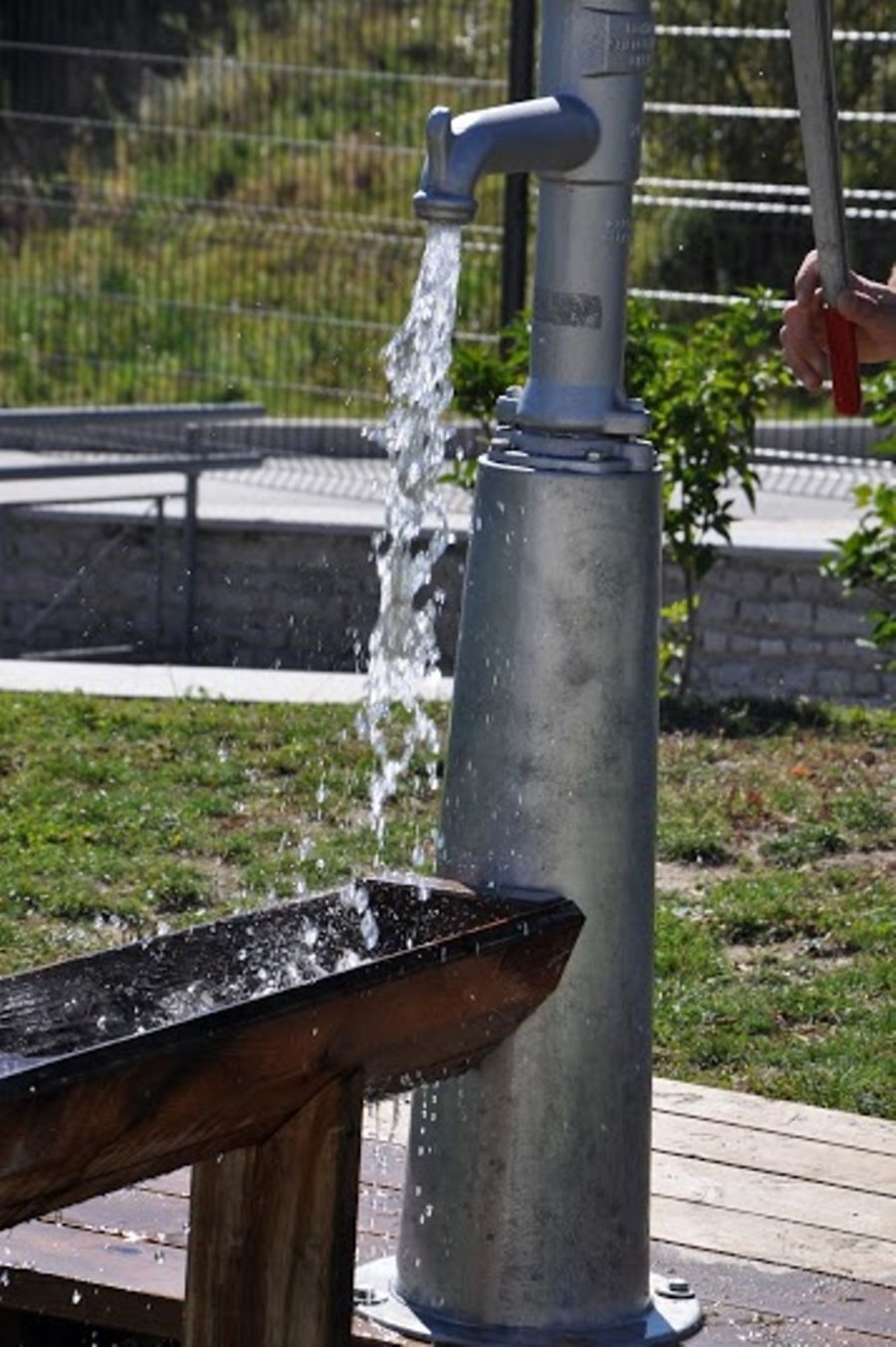 Ръчна помпа за вода, която напомня за ферма, приказен свят или традиционен пазар. Тя насърчава груповата игра и споделено изживяване. Едно дете работи с помпата, докато друго очаква водата да се събере и да повдигне дървения триъгълен канал.