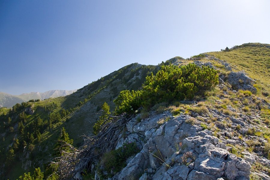 Кратък **рид**, покрит с **клек** и **бяла мура**, го свързва с **връх Конски кладенец**, разположен на изток. От **северозападната му страна** се отделя **стръмният Грънчарски рид**, който служи като **вододел** между реките **Шаралийска** и **Разколска**.