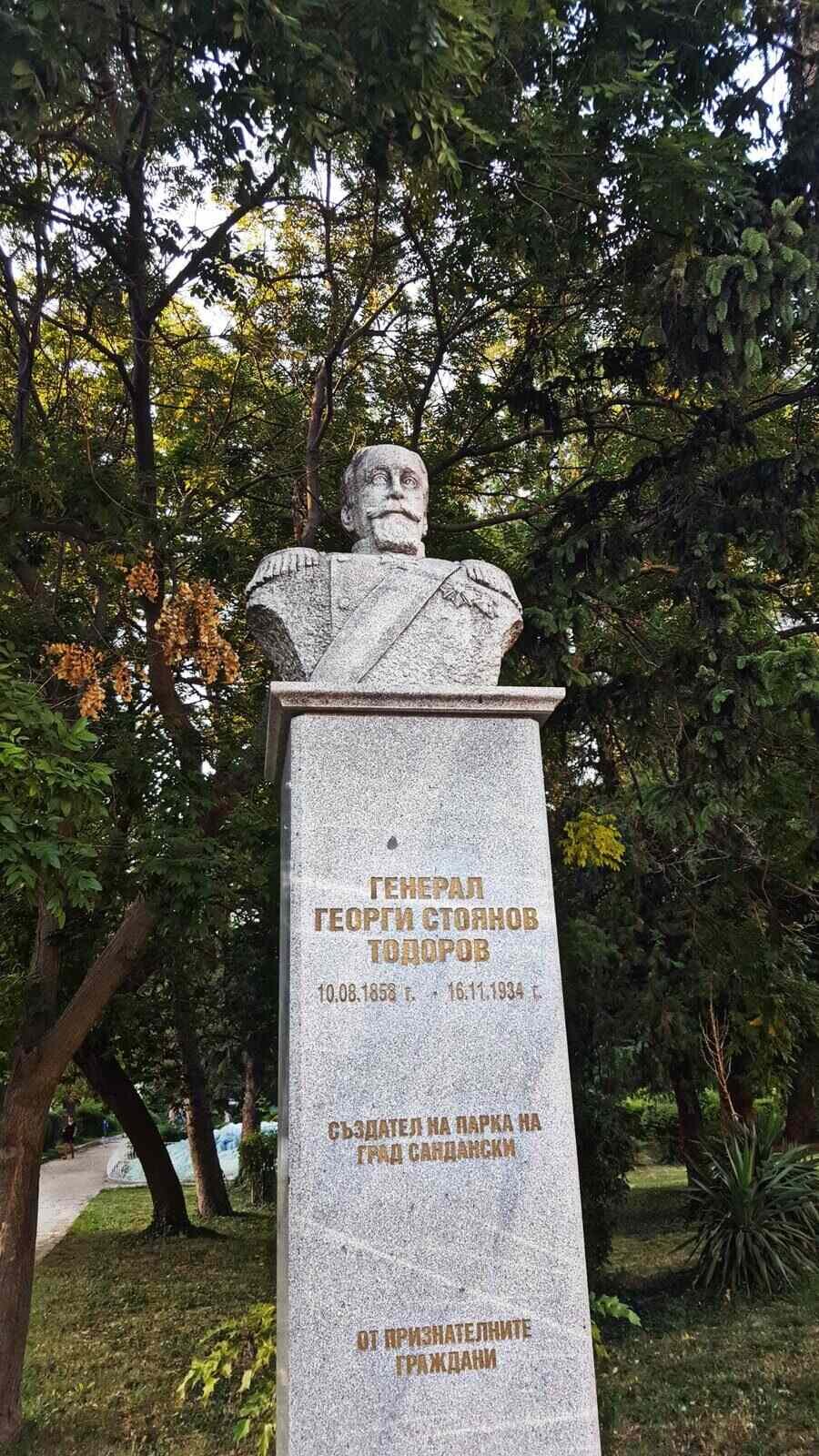 Генерал Георги Стоянов Тодоров е човекът, на когото град Сандански дължи красивия си парк. Паметникът в негова чест е изграден благодарение на средства от местните жители, които искат да отдадат почит. Намира се в непосредствена близост до началото на една алея, веднага след моста. Ако вървите нагоре по пътеката, той ще бъде разположен отляво.