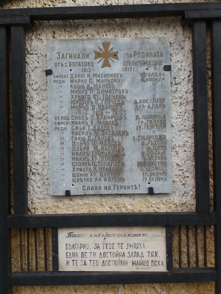 Мемориална дъска с имената на загиналите жители на село Богатово, община Севлиево, по време на войните от 1912–1913 г. Разположена е пред входа на читалище „Отец Паисий – 1922“, близо до централната част на селото и храма „Света Параскева“.