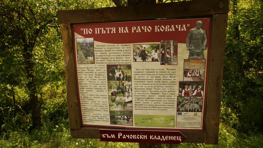 На 10 метра от пътя, близо до село Боженци, все още стои Рачовият кладенец. Името му е свързано с легендарния Рачо Ковач — син на болярката Божана и основател на Габрово. Той напуснал родното си място, тъй като му било тясно там, и поел по древния римски път в търсене на работа. Спирал при кладенеца, пиел вода, напълвал бъкела си и продължил пътя. Намерил подходящо място за ковачница на кръстопът близо до връх Свети Никола, до река Янтра, под сенките на огромен габър. Скоро дошли и други заселници от околните колиби, изградили хан, кръчма, магазин, мелници и съоръжения за обработка на вълна. Така се родил град, кръстен на могъщия габър — Габрово. На герба му са изписани думите на Рачо Ковач: *„Труд и постоянство“*.