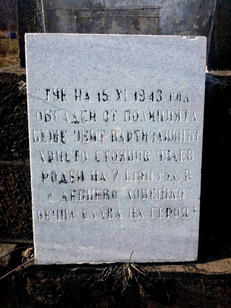 Мемориална плоча в памет на Христо Стоянов Чулев. На това място, на 15 ноември 1943 г., партизанинът Христо Стоянов Чулев е загинал, обкръжен от полицията. Той е роден на 7 януари 1911 г. в село Дебнево, Ловешка област.