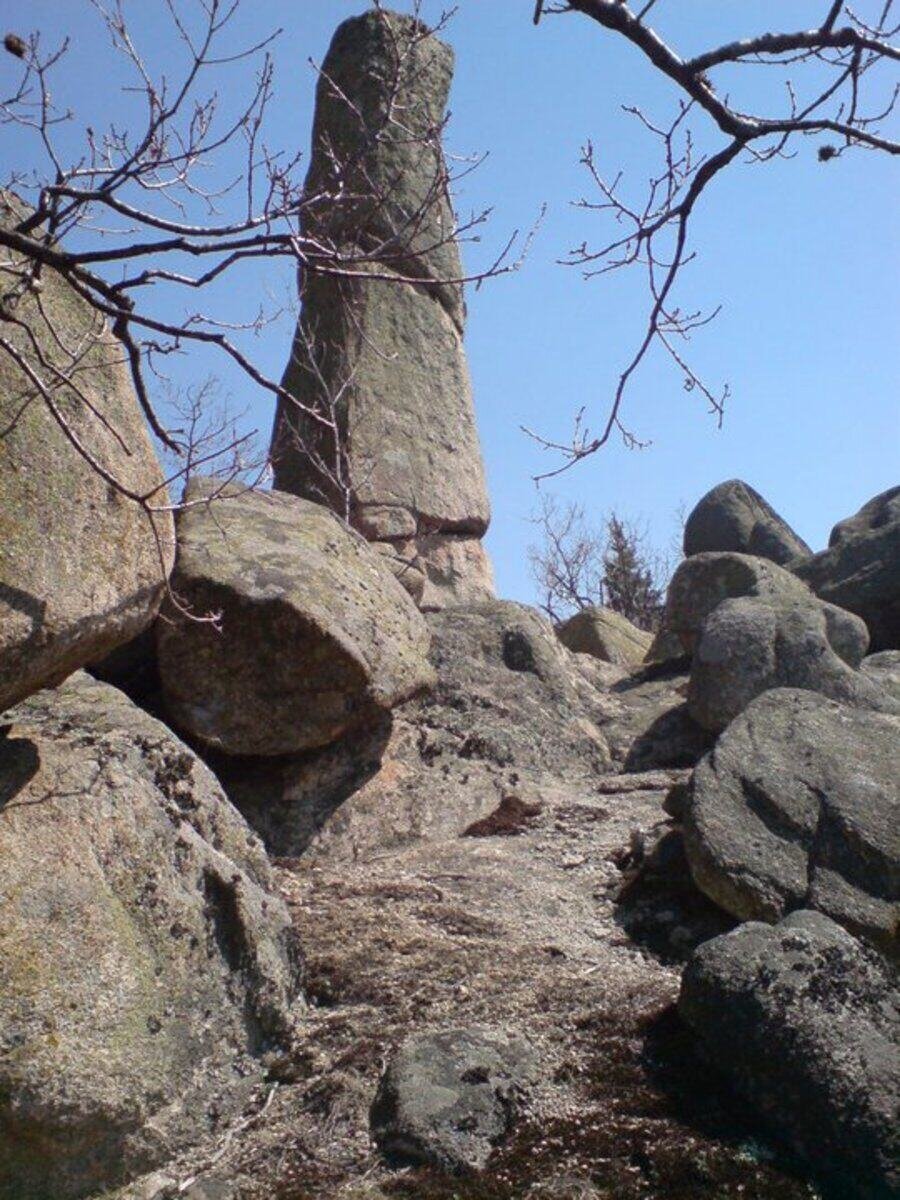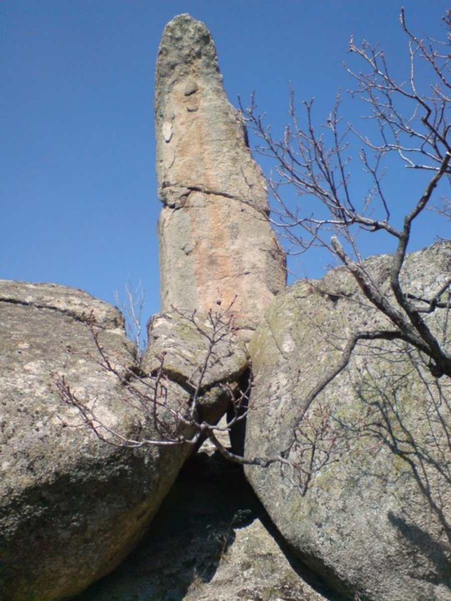 Южно от основния масив, на заравнена скална площадка, стои изправен каменен стълб, наречен менхир. Скалите около него също са оформени с изкуствени вдлъбнатини. Учените смятат, че на семантично ниво менхирът е един от най-древните символи на мъжествеността и на Слънцето. Счита се също, че менхирите са сред най-старите астрономически инструменти, използвани за наблюдение на небесни тела и за определяне на смяната на сезоните.