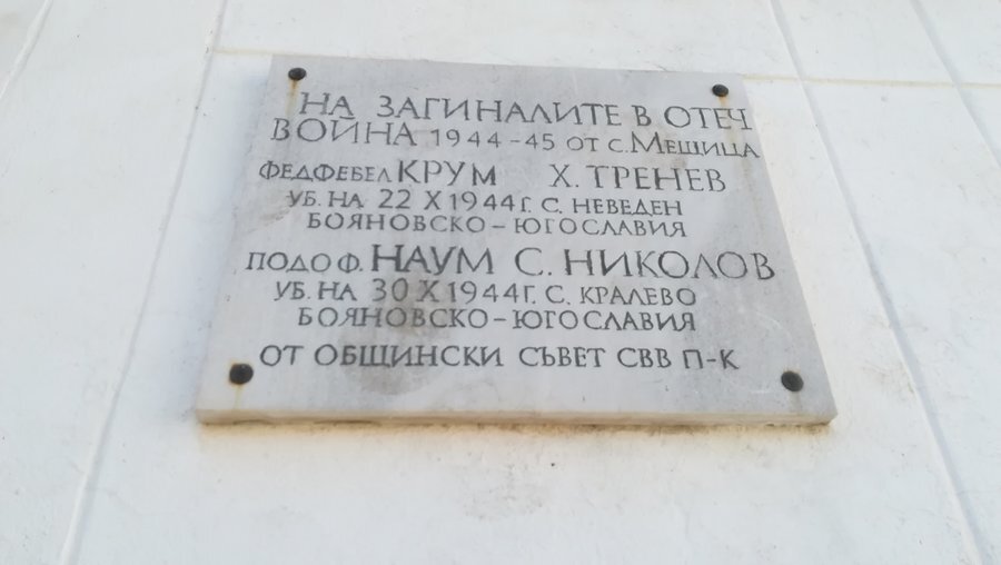 **"Починалите във Втората световна война (1944–1945):** - **Фелдфебел Крум Х. Тренев** загинал на **22 октомври 1944 г.** в село **Неведен, Бояновско, Югославия**. - **Подофицер Наум С. Николов** загинал на **30 октомври 1944 г.** в село **Кралево, Бояновско, Югославия**."