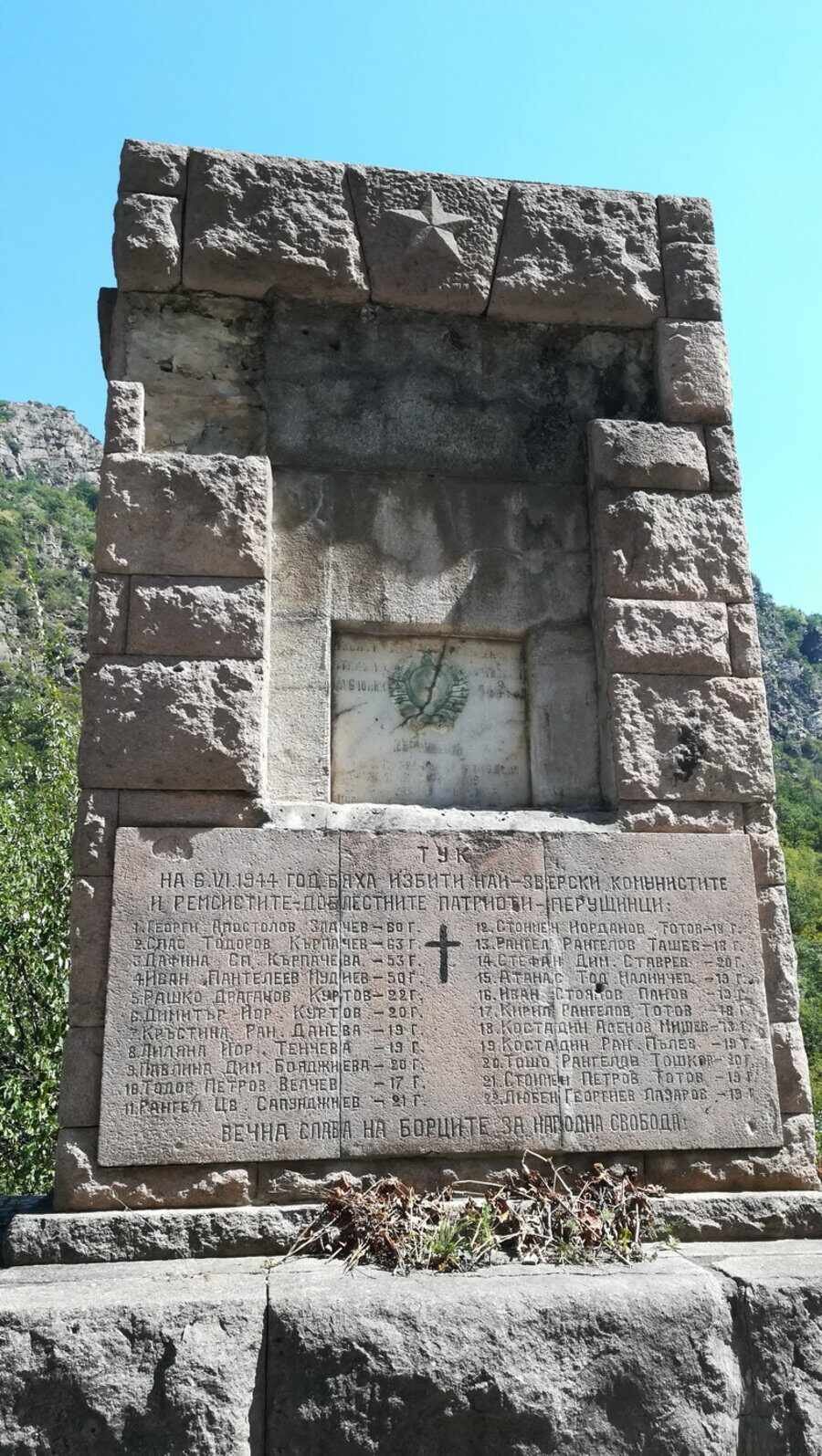 Мемориал в памет на 22 жители на Перущица, екзекутирани без съд на 6 юни 1944 г. На 28 май 1944 г. градът е обкръжен, а жандармерийци, водени от поручик Борис Балкански, арестуват около 60 души – поддръжници и свързани с партизаните. В нощта на 5 срещу 6 юни 22 от тях са откарани с камиони и разстреляни край река Въча, над Кричим.