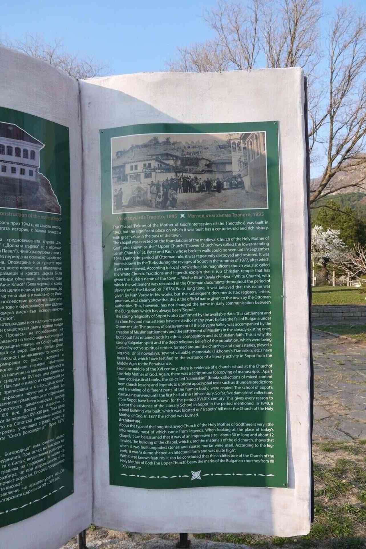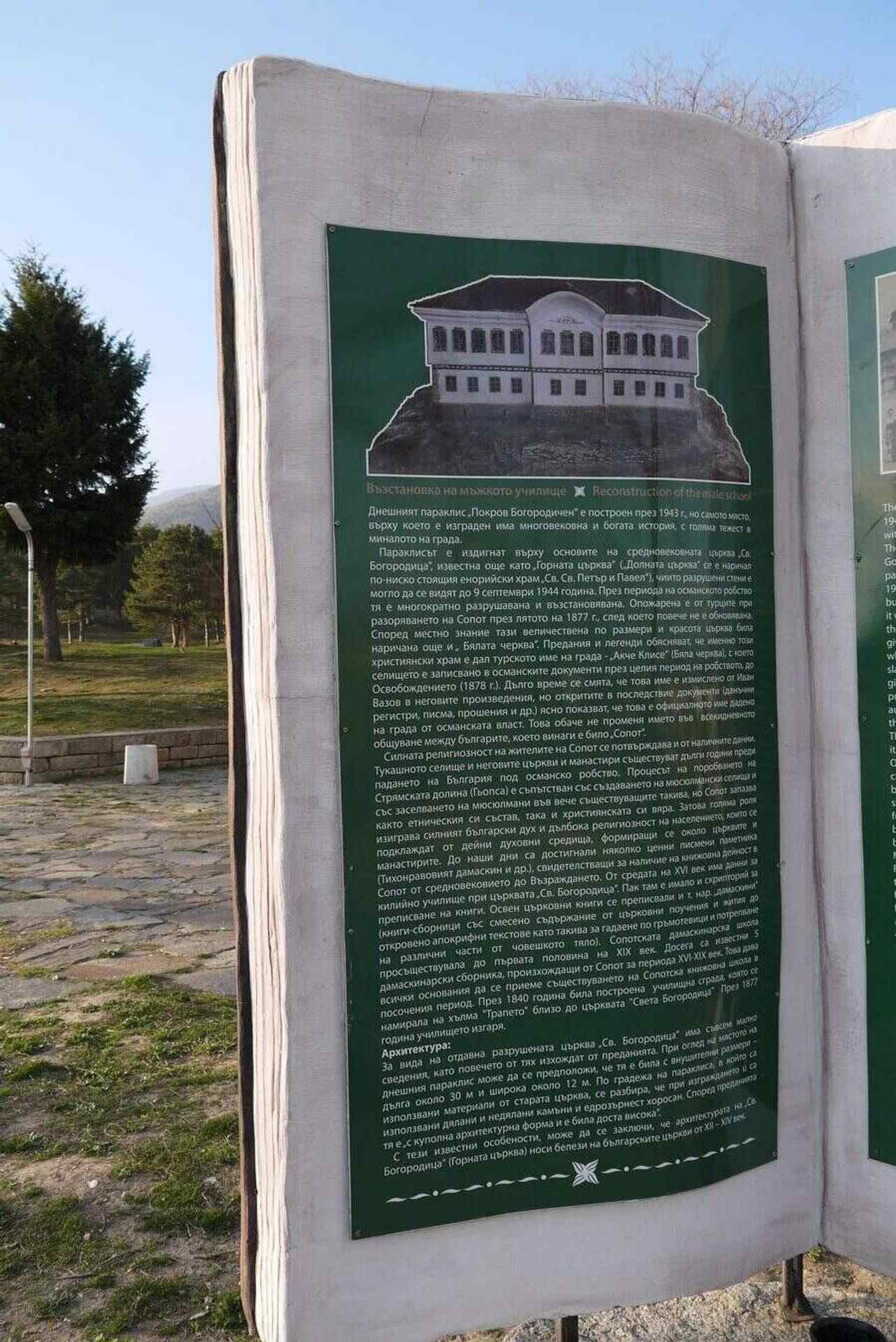 Макетът се намира на хълма, точно до надписа "Аз съм българче" и параклиса "Покров Богородичен". Целият хълм се превръща в експозиция, почитаща паметта на великия Иван Вазов. В релефната книга е поместена информация за мъжкото училище, и църквата "Св. Богородица", намирала се на мястото на параклиса.
