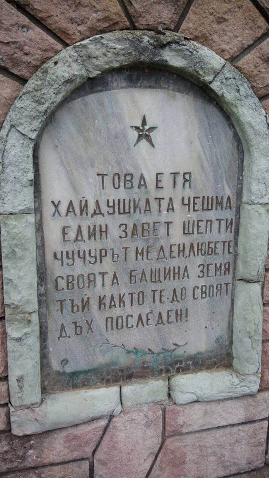 "Надписът на Хайдушката чешма призовава с меланхолични думи: 'Шепни, чучур, меден – обичайте родната си земя до последния си дъх!' До извора е поставена мемориална плоча, на която са изброени имената на четирима ятаци от четата на Хаджи Димитър. Те са били екзекутирани от фашистите на 7 юни 1944 година."