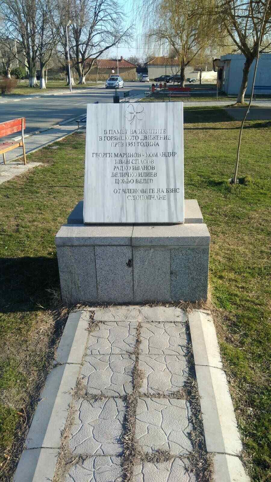 В село Тополчане е поставен мемориал в памет на горяните Георги Маринов, който е ръководил Втора сливенска чета, както и на Иван Спасов, Радко Иванов, Величко Илиев и Цоньо Велев, загинали през 1951 г. Сливенският регион е бил сред най-борите места на съпротива на горяните, което се дължи на тяхната силна воля за свобода и отказа им да приемат насилствената колективизация.