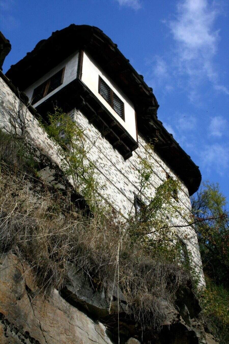 Къщата е впечатляваща отвън, вградена в скала и изглежда сякаш израства от камъка. Построена е основно от камък с дървени греди, наричани сантрачи, и е висока три етажа – близо 9 метра. Покривът е от каменни плочи, а комините са извити.