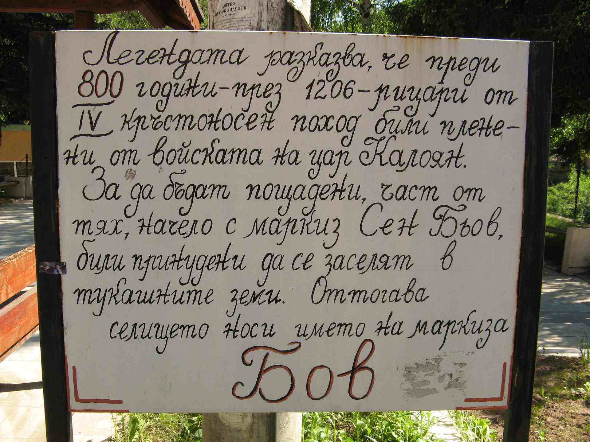 Жителите на село Бов са сътворили легенда, служеща като туристическа атракция. Според нея селото носи името на френския рицар Сен дьо Бьоф, който пленен от воините на цар Калоян , станал негов васал. След смъртта на император Балдуин Фландърски през 1206 г., маркизът получил благоволението на българския владетел да се засели със свои сподвижници в землището на днешното село.