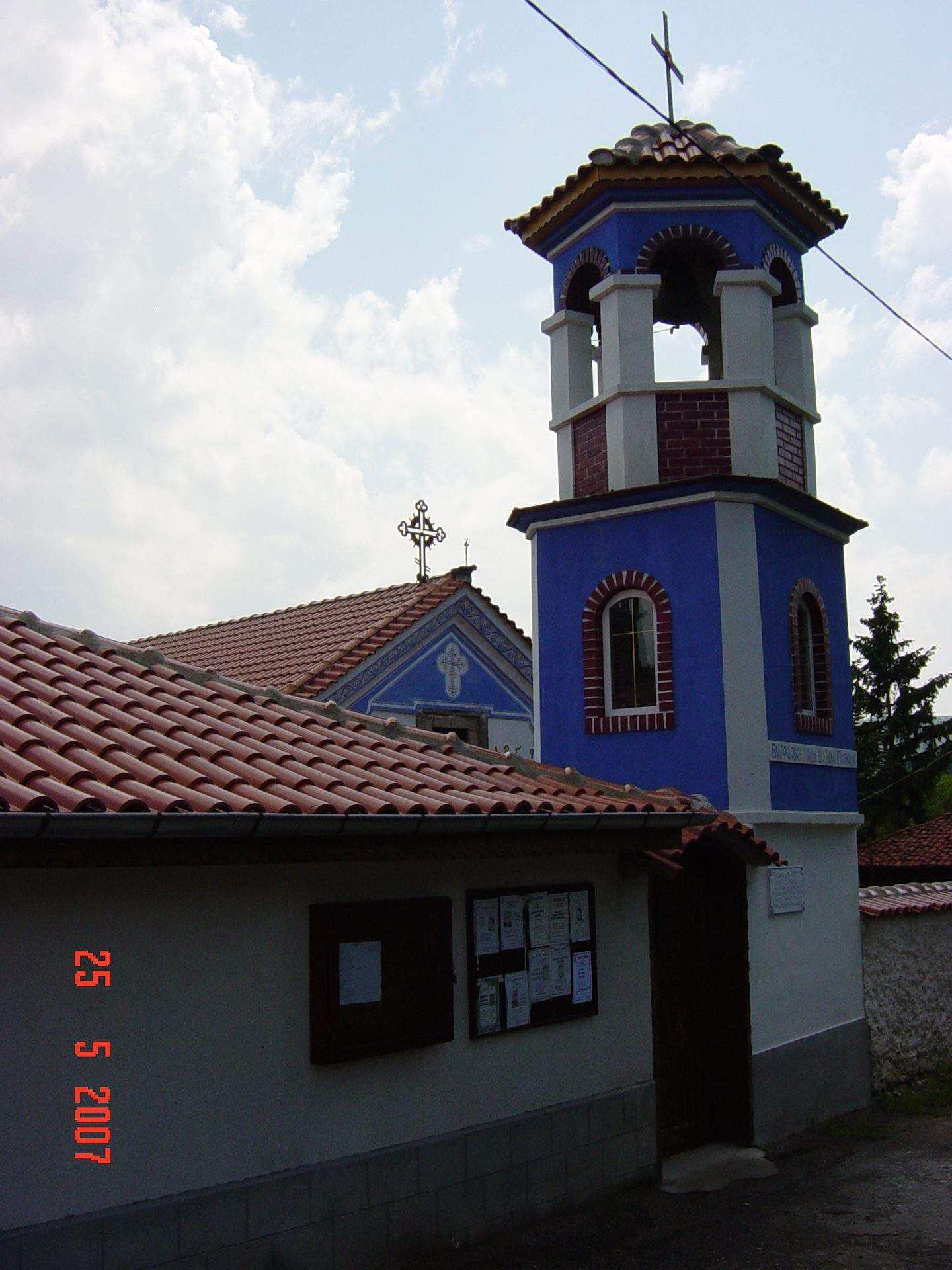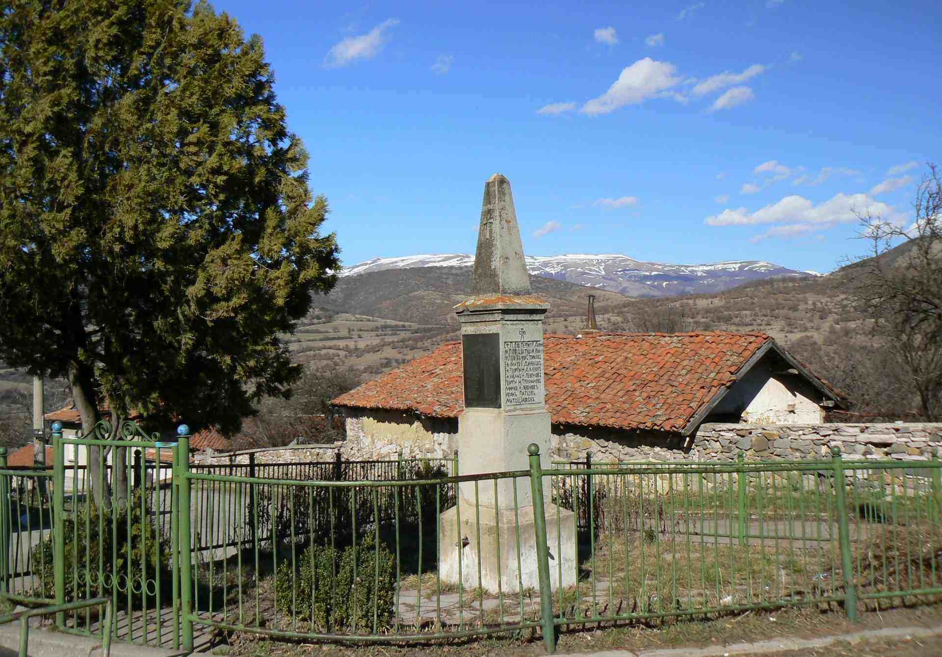 Снимки от село Смолско Църква „Въведение Богородично“ Камбанарията и надписът на фасадата на църквата Паметник на падналите през войните