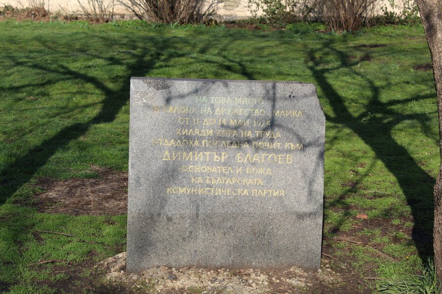 Мемориалната плоча, посветена на Димитър Благоев, се намира в парк "Свети Никола" в София. Тя е разположена там, където преди е функционирал салонът на дружество "Майка". В този салон от 11 до 14 май 1924 г. е изложено тялото на починалия Благоев, за да може обществото да отдаде почит.