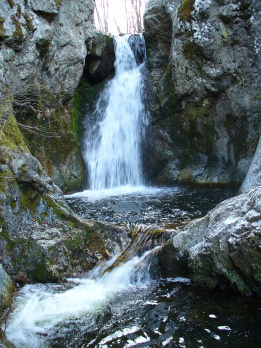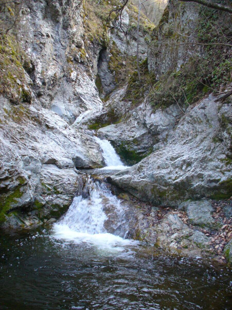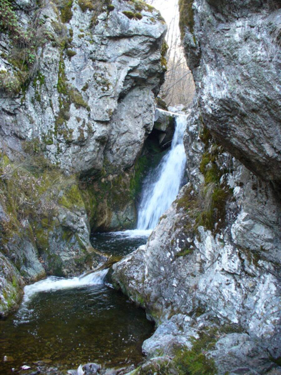 4. След **15 минути** ще видите **беседка** над потока. Нагоре, на **20 метра**, се сливат **два притока** – поемете **десния**.