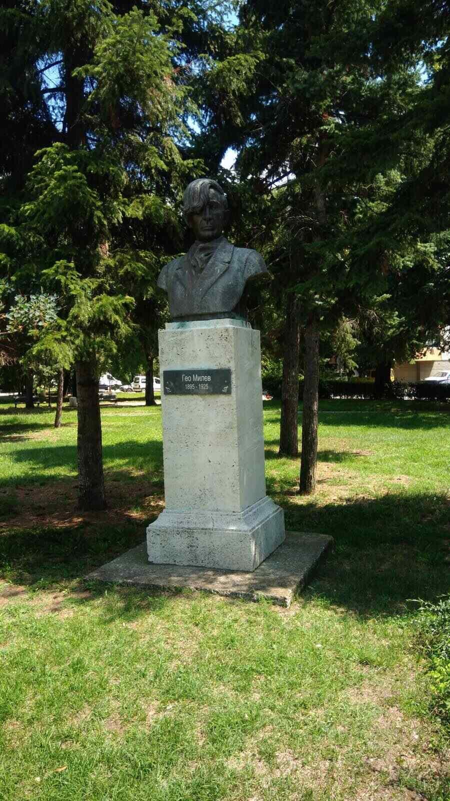 Бюстът на Гео Милев е издигнат в малката градина пред сградата на Историческия музей и Градската библиотека. Творбата е дело на скулптора Тома Попов и е открита през 1963 г. Гео Милев (с рождено име Георги Касабов) е виден български поет и публицист, смятан за един от най-ярките представители на експресионизма в националната литература.